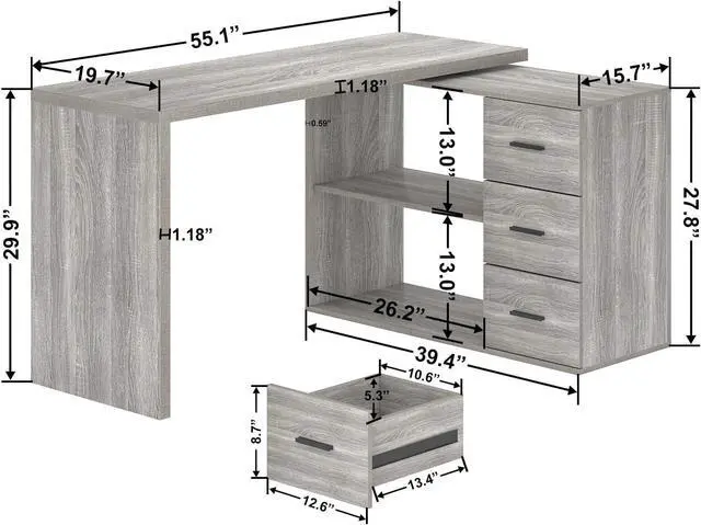 Dimensions: 55.1"W x 19.7"D x 29.9"H 100% Satisfaction ServiceBased on excellent quality, we can provide 24-Hour friendly customer service, 30-Day Free Return and 12-Month Quality Assurance for the l shaped wood desk with drawers- Exquisite Design for