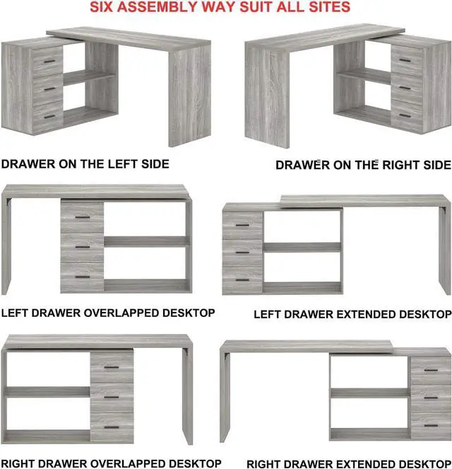 Assemble: The l shaped office desk with drawers is perfect for study room, living room, bedroom and office for a corner or large working space Depending on how your space is arranged, this reversible l shaped desk for home office can be configured in six ways. Elaborate design and clear instruction through all steps allow you to effortlessly assemble this l shape desk with drawers under 45 minutes. All hardware included.