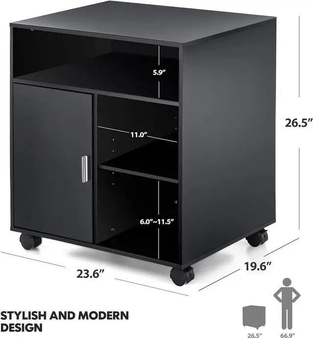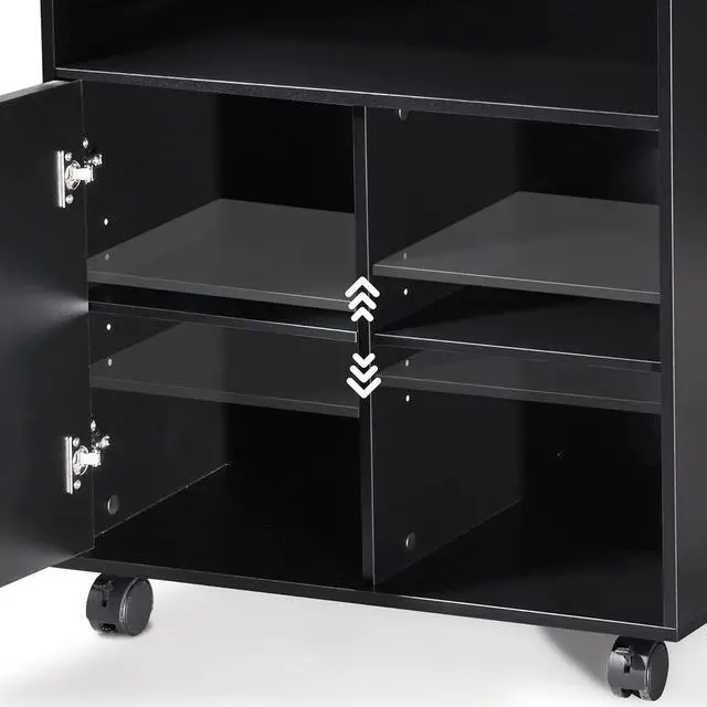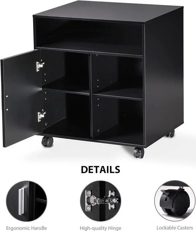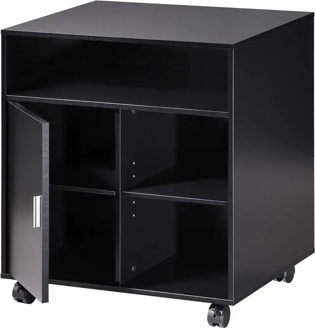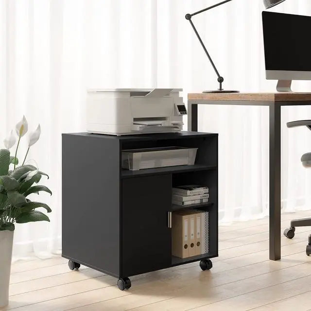- Multiple Storage Spaces: This movable file cabinet has 3 open spaces and one storage space with a door.