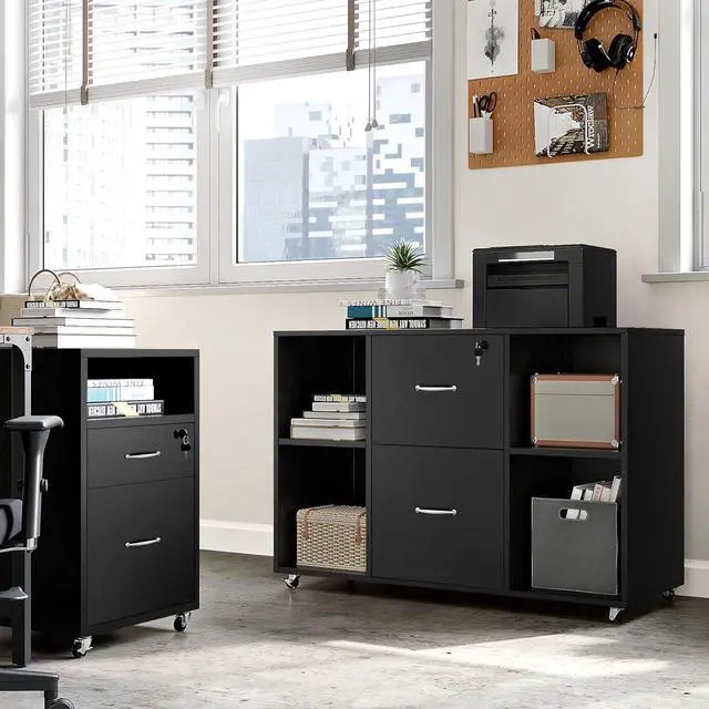 Storage: Comprising a 100 L × 40 W/ 39.5 L × 16 W tabletop, 2 ample drawers and 4 open compartments with a total weight capacity of 150 kg/ 330 lb, this lateral cabinet can accommodate including but not limited to books, files, stationery, printer, lamp, bonsai, and photo frame. Each drawer features adjustable file hanging rails, suitable for US letter size or A4 filesfalse- 1