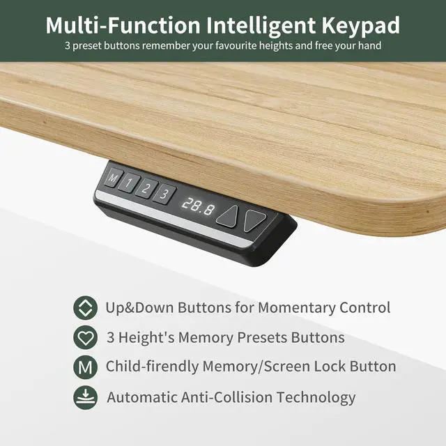 - Electric Height Adjustable: The desk has 3 preset buttons to customize your desired heights from 27.2" to 44.5" with collision-avoiding feature.