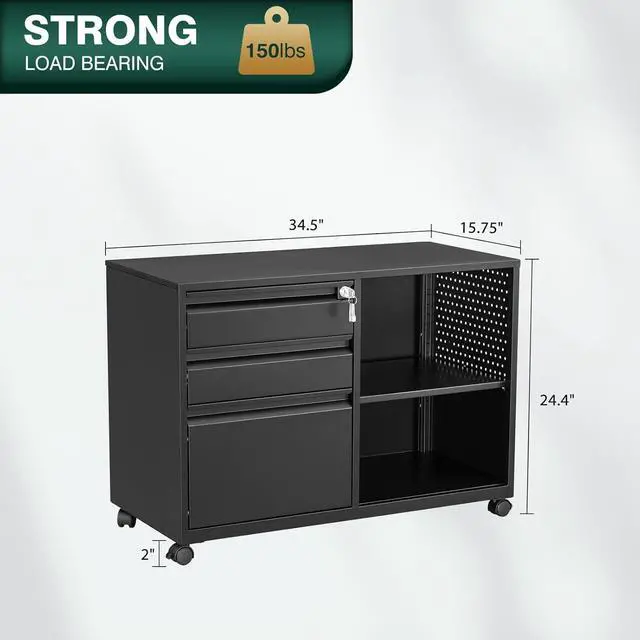 - Ample Storage SpaceThe lateral cabinet features 3 Drawers, overall dimensions 15.75"D x 34.5"W x 24.4"H (including casters).