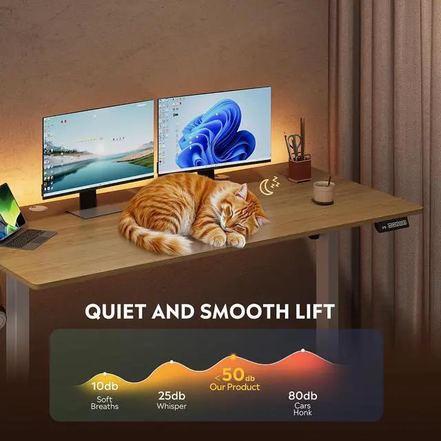 - Customized Sit Stand Desk: The reliable motor operates quietly (under 45 dB) and smoothly, all your things stay steady&secure in motion. The intuitive control panel allows you to preset 3 preferred heights, switch between sitting and standing positions has never been easier. Child lock for total peace of mind.