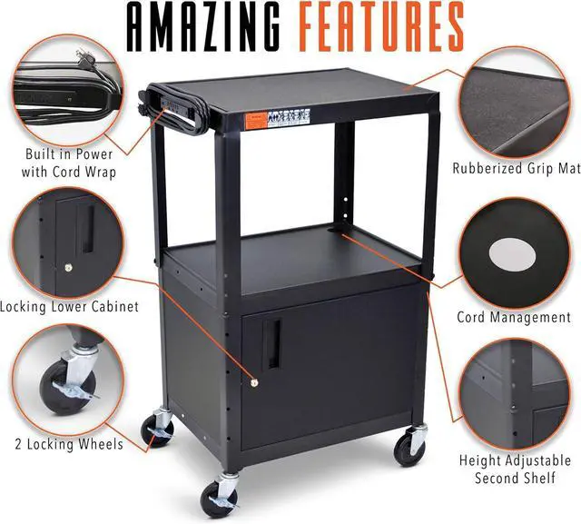 Efficient Cord Management - Manage messy cords easily with grommet holes on the top and middle shelf, and an included three-outlet UL/CSA listed power strip. Ideal for tech and AV utility. falseSafe & Sturdy Construction - Our media carts are built to last with steel shelves that can hold up to 100 lbs. (evenly distributed). A non-slip safety mat on the top shelf ensures our cart is the safest on the market! false- Secure Locking Cabinet - Ensure the safety of your valuables with our Line Leader AV Cart's lockable cabinet, offering unique storage opportunities that other carts can't match.