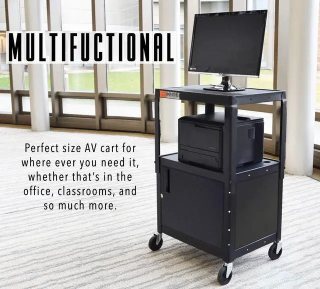 - Adjustable Cart Height - Set your cart to the ideal ergonomic height between 24 - 42 inches. Stand tall during presentations with our height adjustable metal cart, no more hunching over!