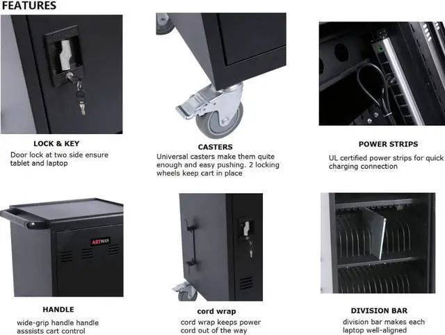 - USER FRIENDLY: Front and back doors open fully for easy access to computers and charging cables. The lockable device cart is ideal for classroom, office, library, hospital, clinics exhibition, coffee shop, airport, training center, etc.