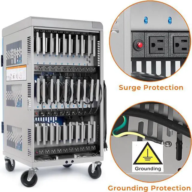 SECURE STORAGE: Protect your devices with padded bays to deter damage, ventilated panels to prevent overheating, surge protectors to protect from power fluctuations, in addition to 2 locking caster wheels to keep cart in place. false- STORE AND CHARGE 30