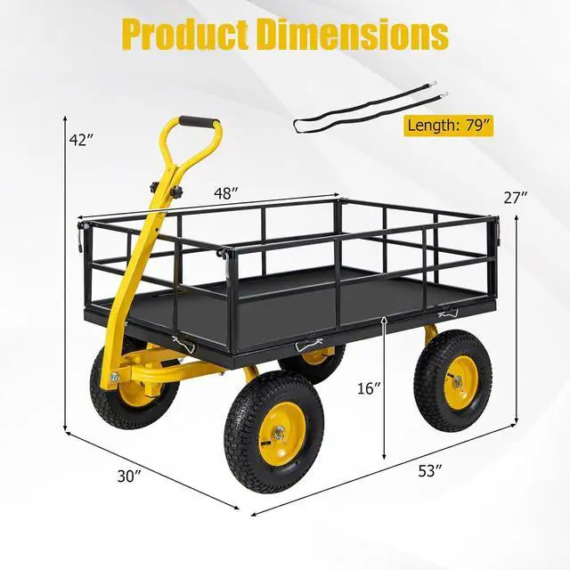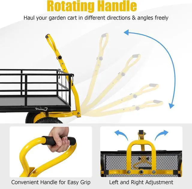 Large Capacity & Ample Storage Space Maximize your garden tasks with a max load capacity of 1200 lbs, ideal for carrying everything from potted plants to heavy cements. The utility garden cart wagon is designed with rustproof steel grids and a detachable rubber mat, ensuring durability and stability, perfect for transporting logs, groceries, and more with ease. Portable Design & Easy to Maneuver Thanks to the rotating handle, it enables you to haul your garden cart in different directions & angles freely. With options for left and right adjustment, this convenient handle offers a comfortable grip, enhancing flexibility and control over your hauling tasks on any terrain.