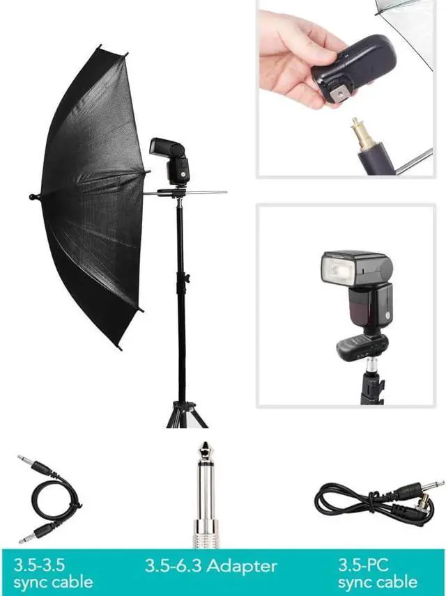 Parcel includes: Transmitter x 1, Receiver x 1, 3.5 to 3.5 mm sync cable x 1, 3.5 mm to PC plug cable x 1, 1/4" mono plug socket x 1, Lanyards x2, Carrying pouch x 1