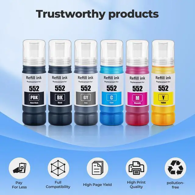552 ink bottles has auto-stop nozzle design - easy filling, no spills, drip-free, no need to squzze the ink bottles! Each bottle for is created to provide you with the CONFIDENCE & PEACE OF MIND that come from printing thousands of pages. If you have any problems, were always here to help.