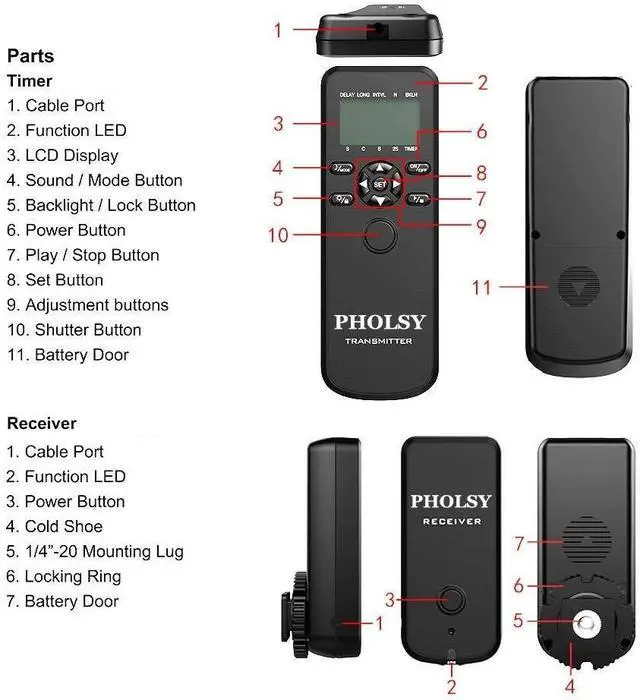Timing setting can be accurate to 0.1 seconds. 5 setting for timing control: Delay (Self timer), Interval (Interval timer) and Long (exposure timer), N (number of frames setting); BKLN (Auto bracketing timed exposure setting for HDR, shutter release with instant, continuous 3, 5 or 7 shots). 4 modes for shutter release control: S (single shooting), C (continuous shooting), B (Bulb), 2S (2 seconds delay)