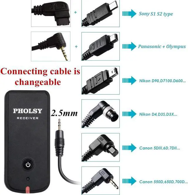 Reduce camera shake and allows you to trigger your camera wirelessly up to 60 metres. You can change different shutter release cable to work with different cameras. Replaces TC-80N3 timer remote control RS-60E3 remote switch, Fuji RR-100, Olympus RM-CB2. Wireless and wired operations.