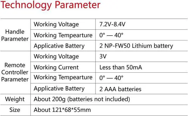 Working voltage: 7.2V - 8.4V (for grip) / 3V (for remote control).