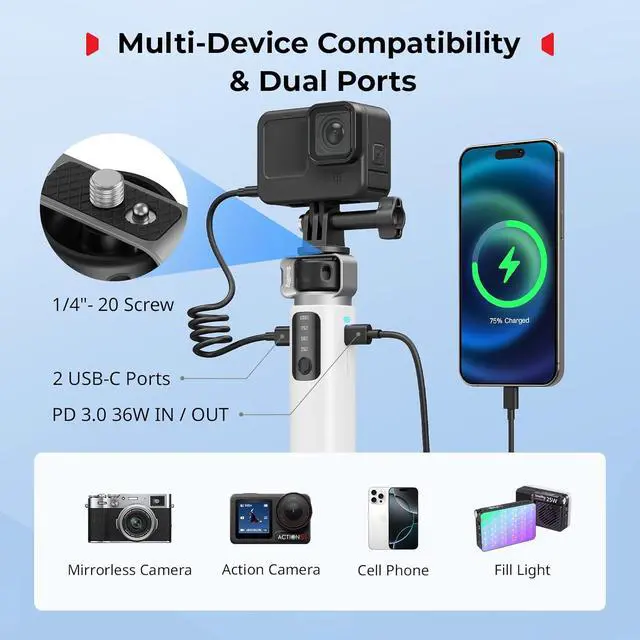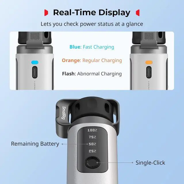 Real-Time Display: This battery grip is equipped with a clear digital display that shows remaining power (0-100%) in real time. As a practical camera battery charger, it lets you check power status at a glanceno more guessing if you have enough juice for a day of shooting or travel. This feature makes the charging handle more user-friendly, whether youre vlogging outdoors or using it as a daily power backup