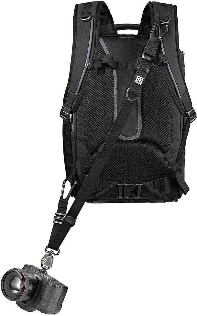 The Backpack Camera Strap is designed to integrate with a backpack that features two shoulder straps so that it can be worn across a right or left-handed user's body, draped from one backpack shoulder strap to the opposing hip. A connected camera can then rest upside-down along the hip so that it can be quickly raised for use. Aluminum-alloy snap-lock carabineers allow the Backpack Breathe to securely attach to any D-rings or loops along a backpack's shoulder strap that are typically above a backpack's sternum strap. The other end of the Backpack Breathe can then be clipped below the ladder-lock buckle on the backpack's other shoulder strap.