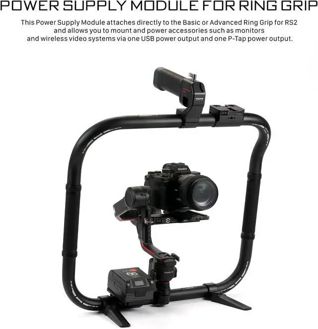 WARNING: Please take extreme caution when connecting P-Tap power cables as connecting cables backwards can damage your gimbal This Power Supply Module attaches directly to the Basic or Advanced Ring Grip for RS2 and allows you to mount and power accessories such as monitors and wireless video systems via one USB power output and one P-Tap power output.