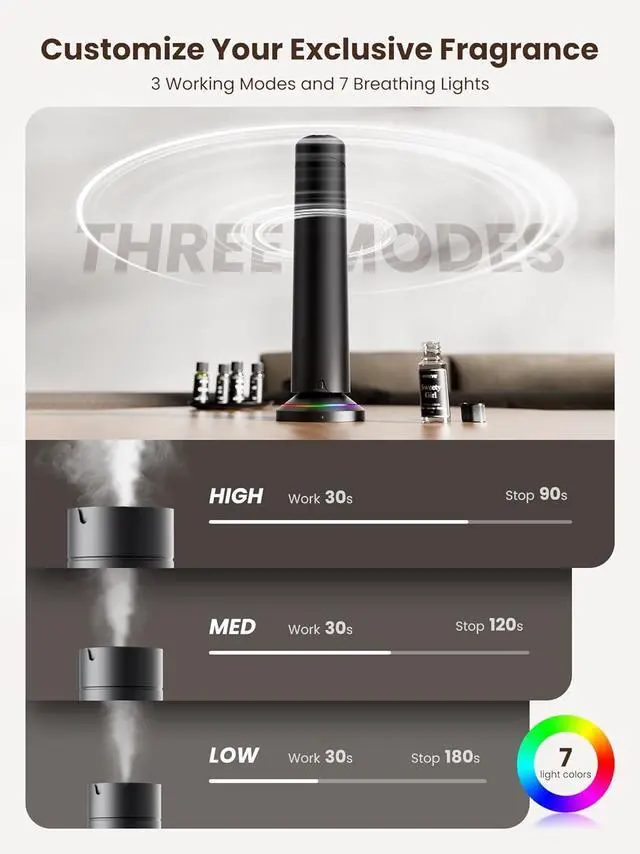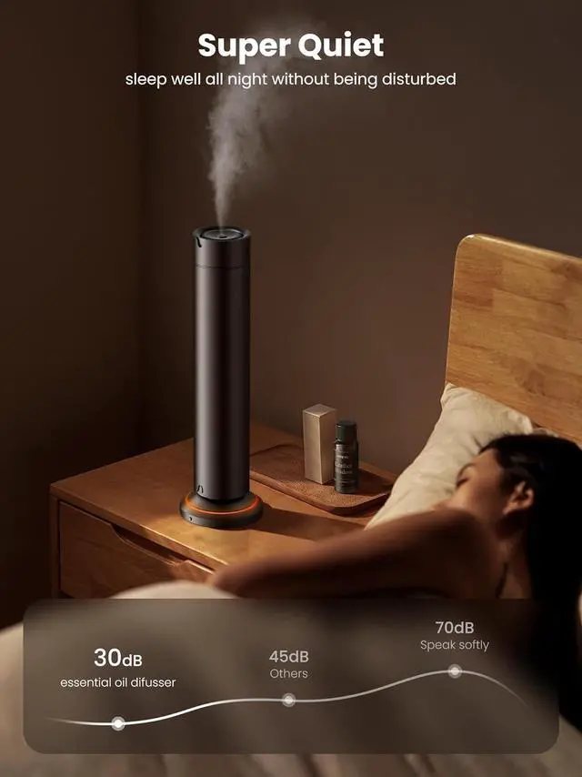 Ultra-Quiet Operation & 7-Color Soothing Mood LightHelp you sleep deeply and create the perfect space for relaxation and sleep. Nearly silent operation (<20dB) won't disturb your work or sleep. The essential oil diffuser with soft, 7-color cycling LED light (with optional on/off function) adds a soothing visual element to your space, helping you relax and drift off to sleep.