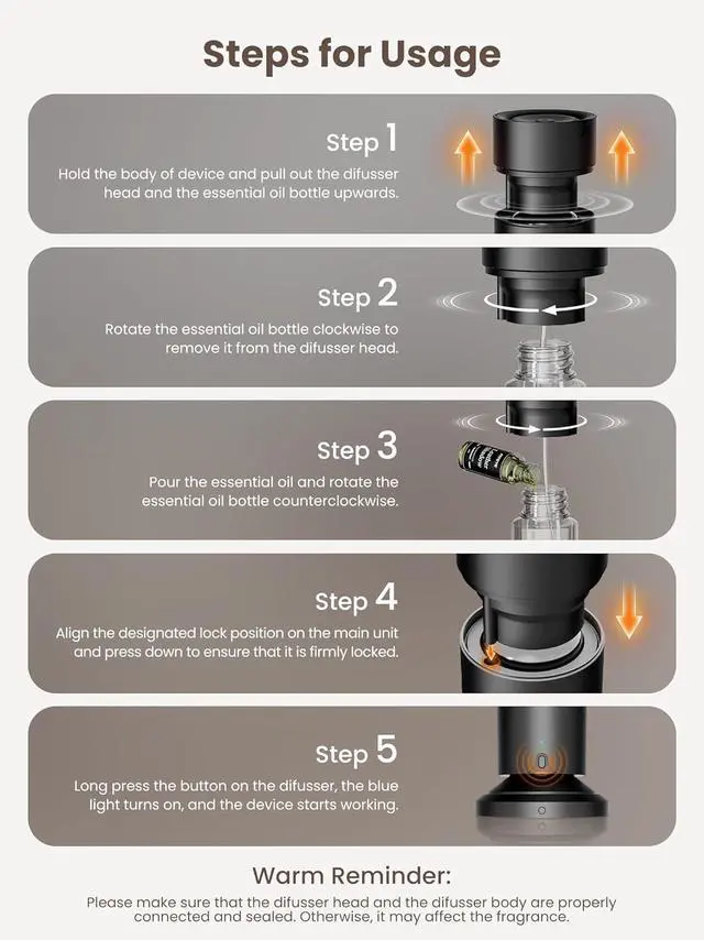 Elegant Design, Fits Any Space waterless diffuser boasts a sleek, modern design and powerful diffusion capabilities, making it suitable for bedrooms, offices, hotels, and more. It can enhance focus in your home office, create a spa-like atmosphere in the bathroom, foster a tranquil ambiance in the bedroom, or greet guests with a refreshing aroma in the living room.