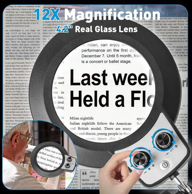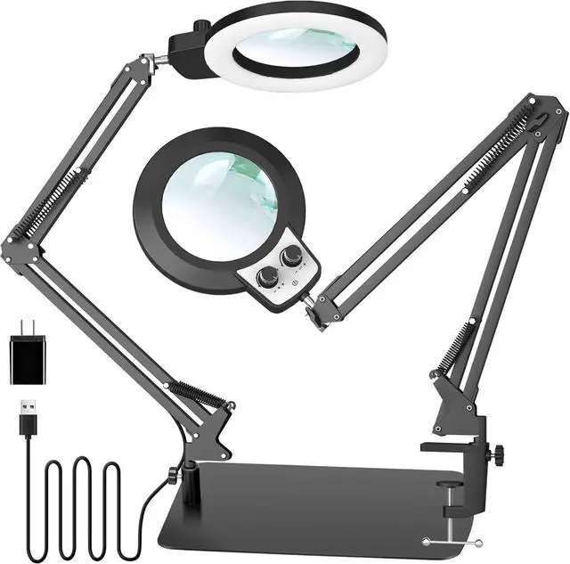 Stable Clamp: The 12x8-inch super large base and clamp provide stability and flexibility, it will not fall down no matter you stretch the magnifying glass with stand to any angle. The upper and lower sides of the clip are equipped with foam pads, which completely prevent your table from being scratched and increase the stability of the clip. The adjustable arm allows you to position the lighted magnifying glass at the perfect angle for your comfort and convenience.