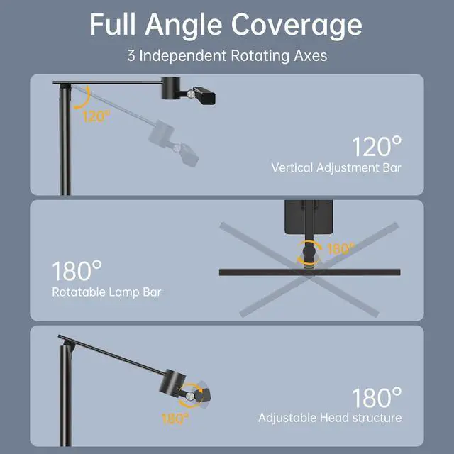 Multiple Lighting & Full-Angle AdjustabilityEasily switch between 3 color temperatures and 3 brightness levels to suit any task or mood. The built-in memory function recalls your last-used settings, even after powering off. Designed with 3 independently rotating axes120° vertical bar, 180° lamp bar, and 180° adjustable headfor full-angle coverage and precise lighting control.