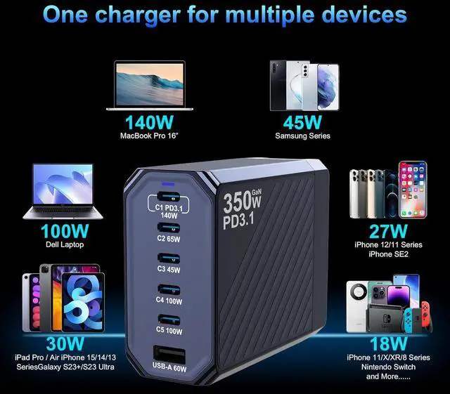 Portable and Compact Design: 5C1A ports ultra-compact design to keep your electronic multiple devices charged without taking several bulky charger during the journey, and along with a foldable wall plug that retracts when not in use, minimizes the 350W USB C wall charger's size for easy portability, and to avoid scratching other objects in your bag, making it ideal for a trip or business travel
