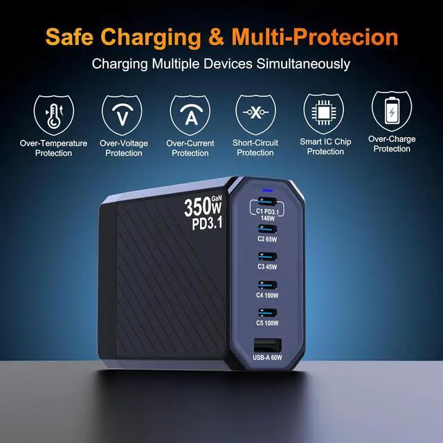 Advanced GaN Technology: The 350W usb c charger utilizes GaN technology for higher charging efficiency and lower heat loss, which ensures charging speed while reducing the charger's heat generation and prolonging its service life, and built-in multi-protection system and premium microchips, makes our chargers smaller and safer