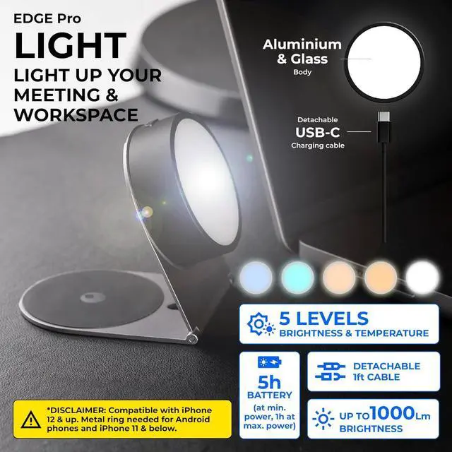EDGE Pro Light magnetically snaps on the EDGE Pro Core. Its been designed to light up your calls and your workspace, with improved features like the 1000 lumens brightness, 5 different brightness/temperatures levels. You can light up your meetings with or without the included USB-C to C cable (30cm / 1ft), enjoying 1 hour of pure brightness at maximum power or up to 5 hours of light at the lowest intensity.