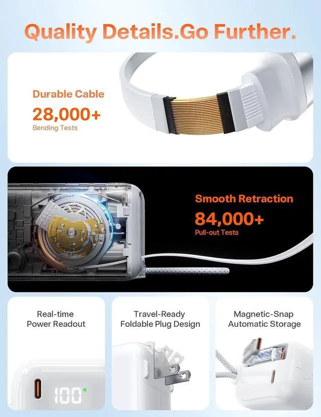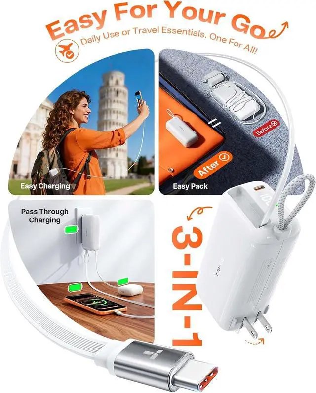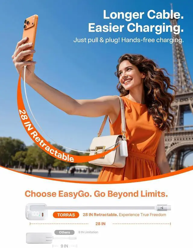 -Redefine your Pass-Through charging experience. Simply plug your EasyGo into any available outlet to charge both the power bank and your phone at the same time. Thanks to the integrated 28-inch retractable cable, you can comfortably browse the web, watch short videos, or continue using your phone while it chargesno more being tethered to the wall by a short cord. Its effortless power, redefined