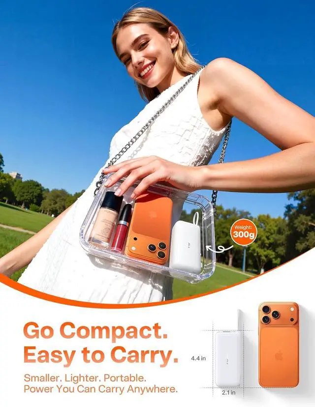 , Despite its powerful features, the EasyGo remains incredibly compact and lightweight at just 300g and 4.45 x 2.09 inches. Its sleek, minimalist design is built for mobility. Slip this portable battery charger into your carry-on or daypack, and youre ready for international travel or a spontaneous weekend hikethe ultimate portable power for those who move