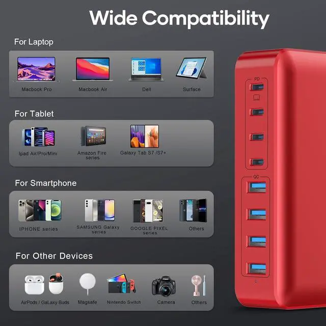 Fast charging capabilities for laptops, MacBook, iPhone, iPad, and more, ensuring quick and efficient power delivery. 8-port charging station with flat plug and braided power cord, perfect for charging multiple devices simultaneously.
