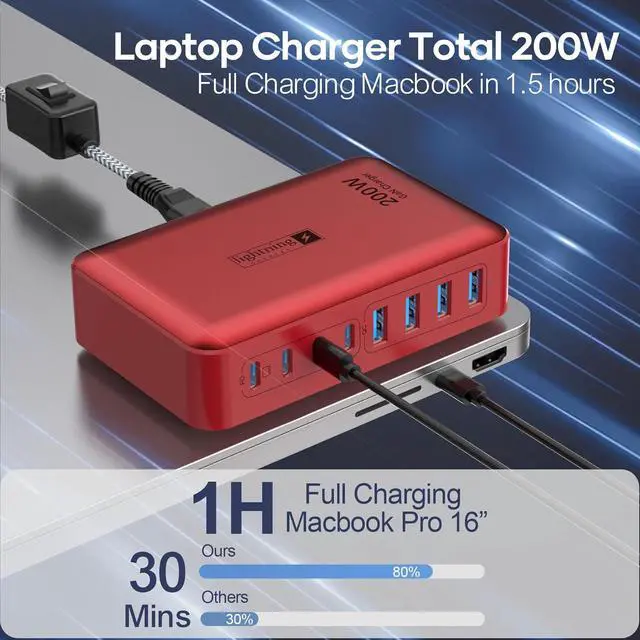 Powerful 200W GAN charger with USB-C and USB ports, compatible with Apple, Samsung, and other devices.