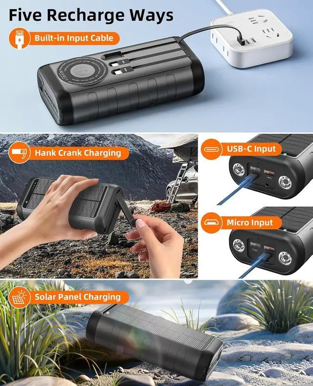 Five Different Charging Methods: 59800mAh External battery charger with solar panel can recharge by sunlight, outlet(2 input ports & 1 input cable) or hand crank generator. However, solar charging is affected by the intensity of light and its area, so the charging time will be very long, and solar charging can only provide a trickle of current. The power bank's cable is slower than the USB-C output port and is only suitable for emergency use. It is recommended to use a fast-charging head and cable to charge through the USB-C port for daily use.