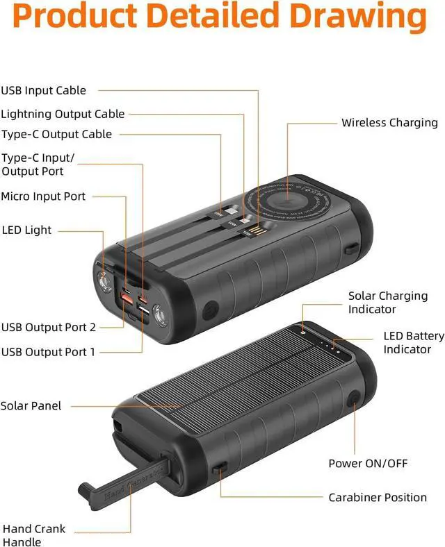 Hand Crank Solar Power Bank: This phone charger adopts innovative technology to combine the solar charger with a hand crank generator. Simply rotating the handle on top makes it possible to provide power during an emergency or natural disaster. Besides, it has multiple fast-charging input ports and cables (Recommended recharge ways). Get power at any time!