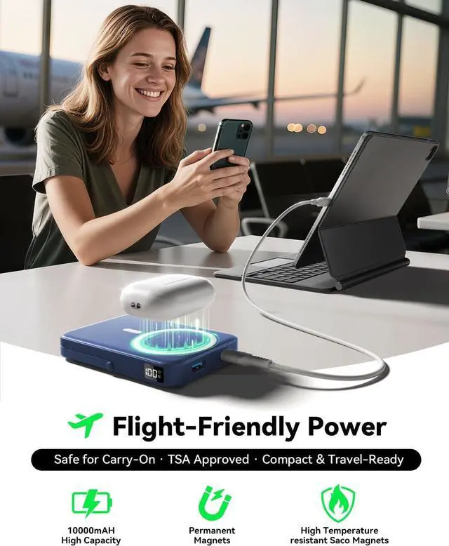Slim and Portable for TravelUltra-slim for magsafe power bank fits easily into your pocket or handbag, making it the ideal portable charger for iPhone 15/14/13/12 series. With 10000mAh capacity, its approved for carry-on during flights and perfect for work, travel, or outdoor adventures. The matte anti-fingerprint finish adds a clean, professional look to this wireless charger, keeping it stylish wherever you go.