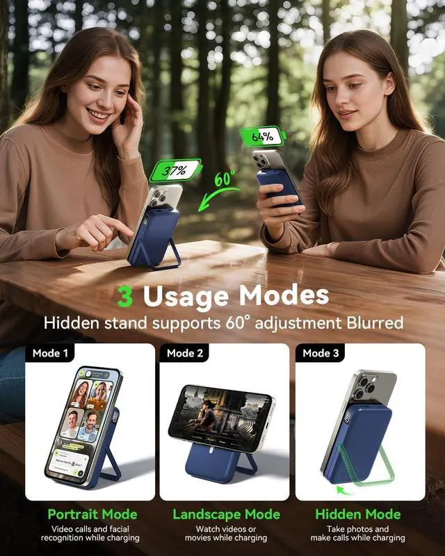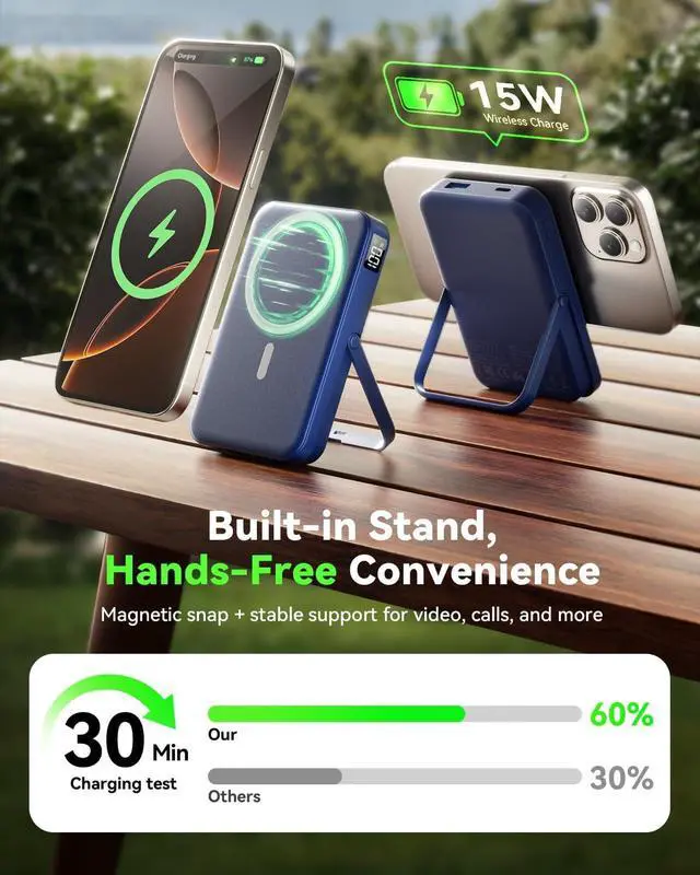 Foldable Stand for Hands-Free UseEquipped with a sturdy foldable stand, this wireless charger for MagSafe iPhone easily transforms your device into a mini workstation or entertainment screen while charging. Use it vertically for FaceTime or horizontally for Netflix. More than just a power bank, its a practical portable charger that adds convenience to work, travel, or daily use.