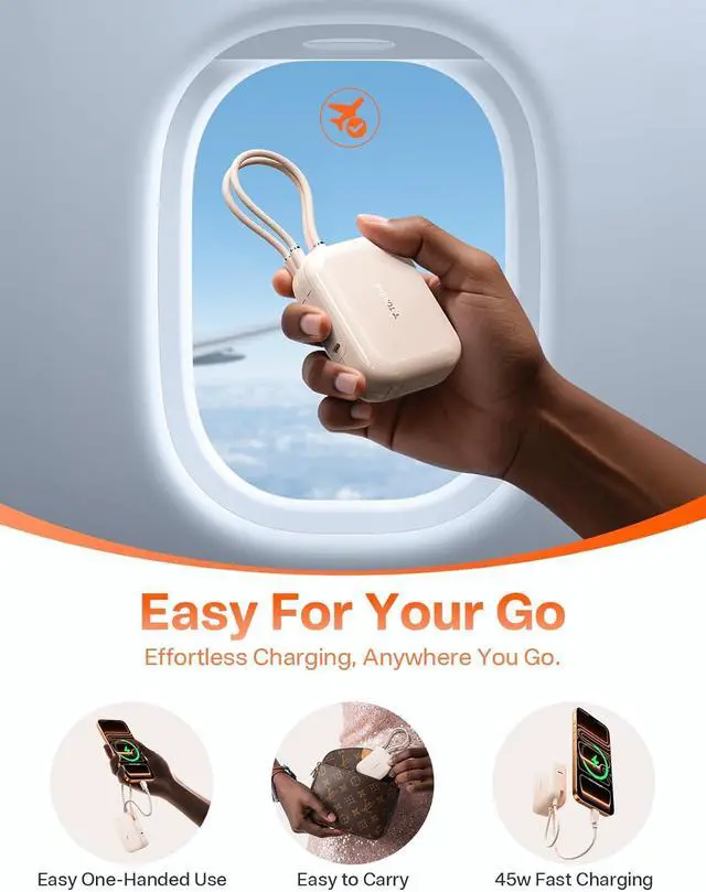 - -: The EasyGo Small Power Bank includes two built-in USB-C cables. Say goodbye to forgotten cables and messy bags! Our cables are crafted from premium nylon braided material, ensuring exceptional durability. They've been rigorously tested to withstand over 28, 000 bends and can support up to 15kg of weight, guaranteeing "0" risk of breakage
