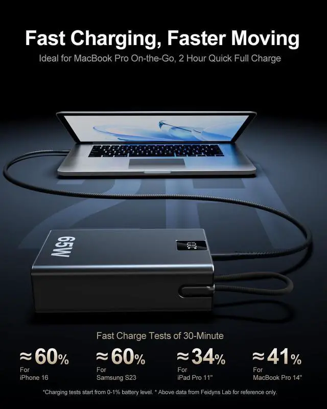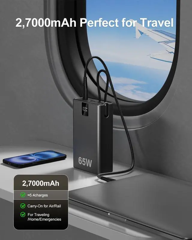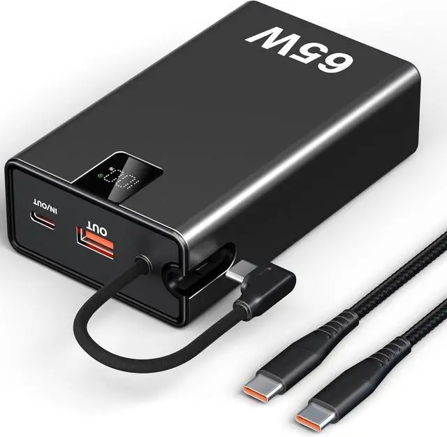 Once: With 3 charging ports, including 1 blazing-fast PD 65W USB-C out port, a PD 65W USB-C cable, and a trusty USB-A port, this power bank is your all-in-one charging solution; It works seamlessly with various cable types, ensuring rapid charging for all your devices;