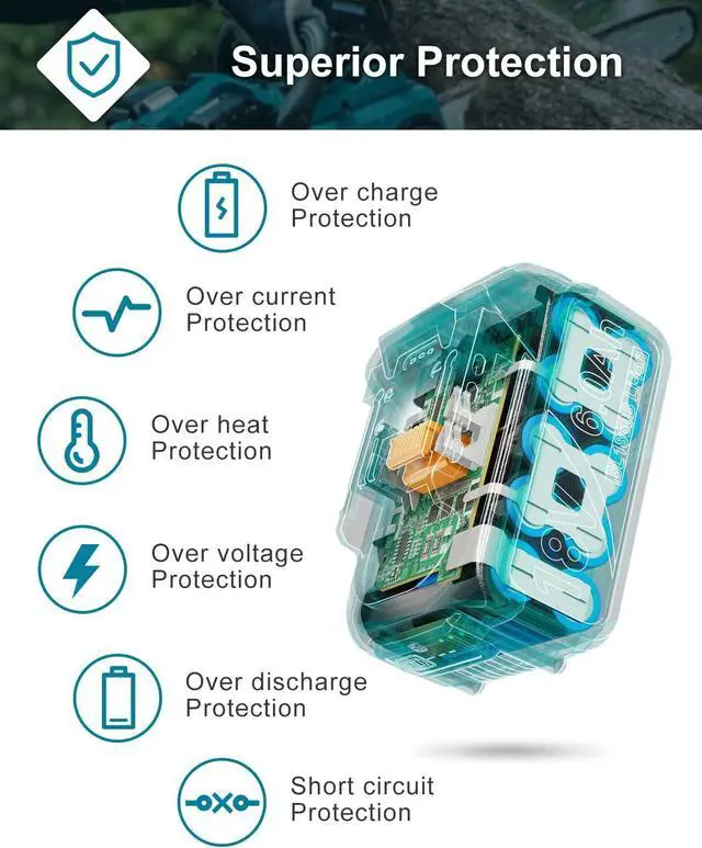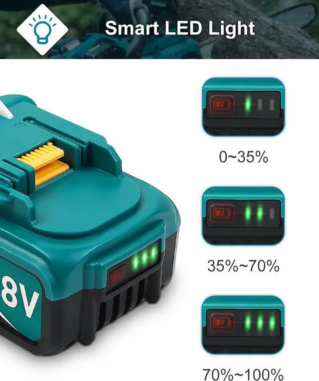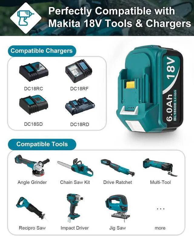 Wide CompatibilityReplacement for Makita 18v battery BL1830B BL1840B BL1850B BL1860B BL1815 BL1820 BL1825 194309-1 194205-3 194204-5 LXT400, etc. Compatible with Makita 18v tools BC BD BH BJ series & chargers DC24SC, DC18RA, DC18RC, DC18SD, DC18SE, DC18SF, etc.