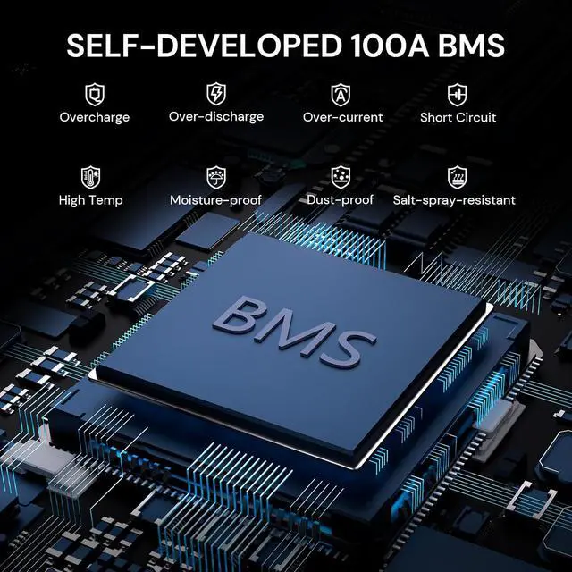 Smart 100A BMS ProtectionEquipped with 100A Battery Management System (BMS), Against overcharging, over-discharging, over-current, overheating, and short circuits, as well as Dustproof, IP65 Waterproof, Salt spray proof. Additional upgraded low temperature cut-off protection further enhances battery safety. Designed for harsh environments, including rain, marine conditions, dusty or humid settings, and extreme cold