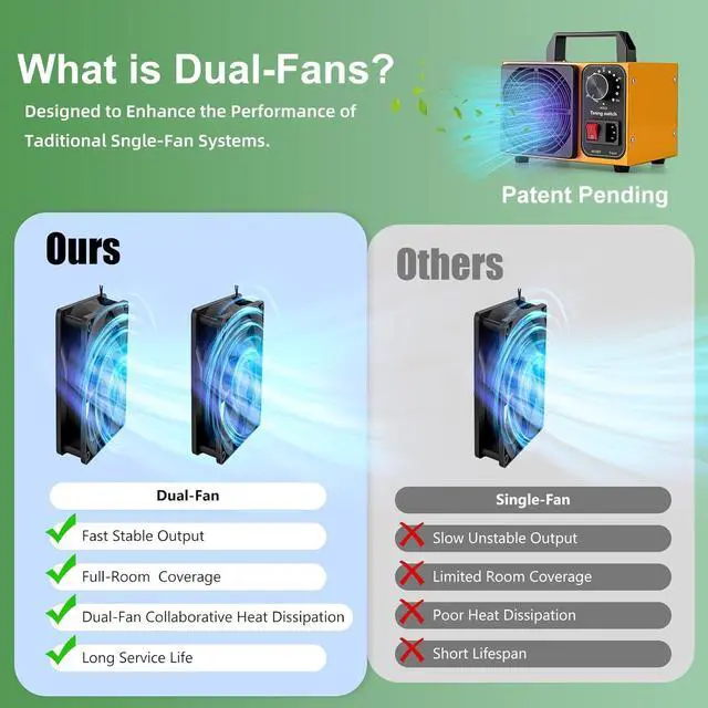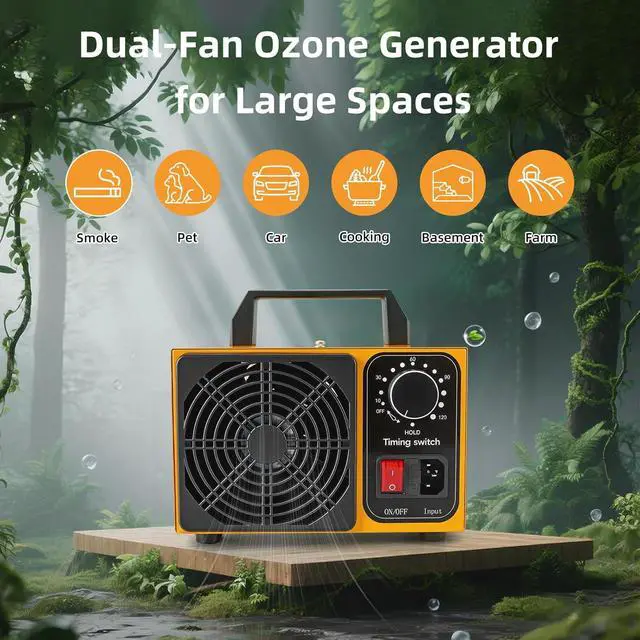 Versatile Applications \ 360° Odor EliminationThe advanced dual-fan design provides complete 360° ozone coverage, even in irregular spaces. Perfect for homes, cars, offices, commercial spaces, boats, basements, smoking areas, and pet rooms