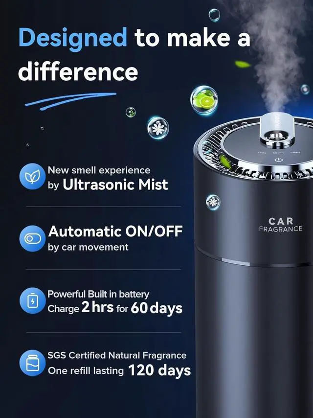 Long-Lasting Battery Life Powerful Built-in Battery Gets up to 2 months of use from two hours charge, ensuring your car fresheners long lasting without the hassle of frequent recharging
