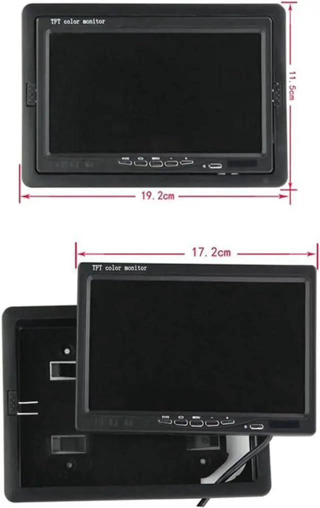 4Pin 7inch TFT LCD Monitor high resolution image (800x480 Pixels), full color display and low power consumption, adjustable brightness, contrast and color. Image can be rotated horizontally and vertically for mirror or none mirror viewing with 2 channel video input, V1/V2 button switch, 2 connect plug, V2 is remote by Blue wire for reversing use priority