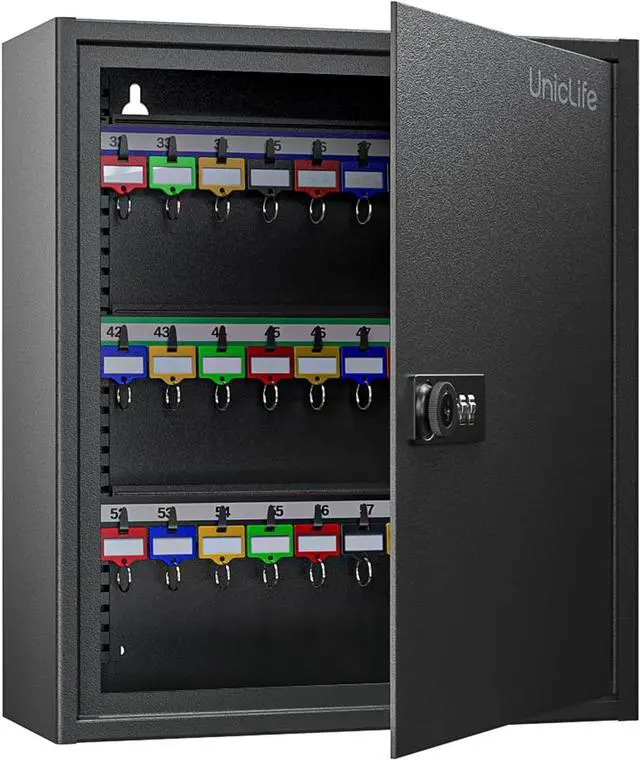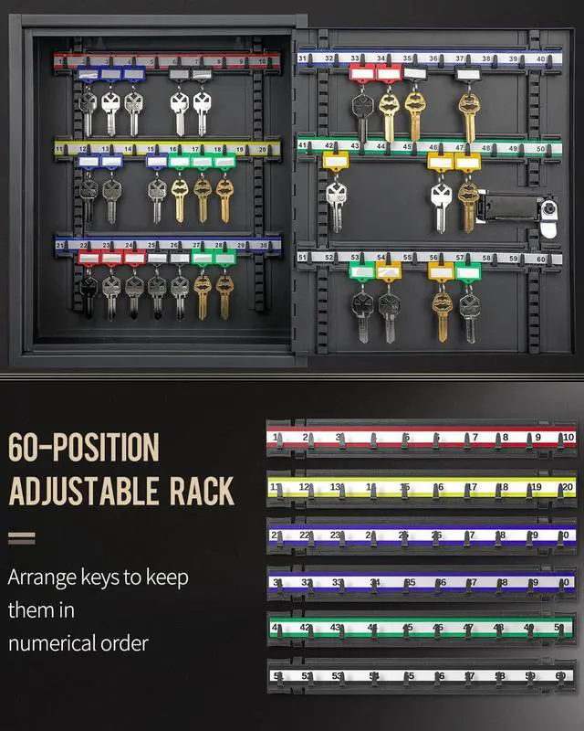 Adjustable Racks: Equipped with 6 sturdy metal racks allowing for free adjustment of height. The stickers and hooks on each rack arrange keys in numerical order and keep them neatly organized.