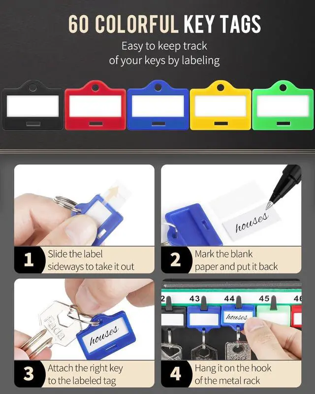 Track: Contain 60 key tags (5 colors) to mark keys. Insert or remove each label by sliding it sideways to avoid tilt. And the numbered log sheet makes it easier to keep track of your keys. (Screws, wall anchors and a pen are included. )