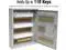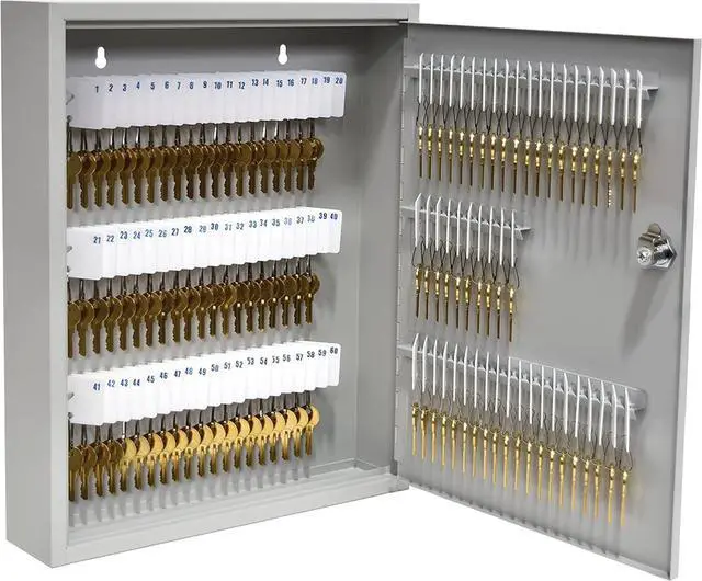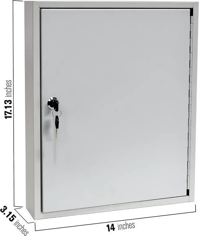DIMENSIONS: The key storage box measures 14-inches in width, 17.13 -inches in height, and 3.25 -inches in depth. It includes 110 numbered key tags, 11 out key on yellow tags, and mounting hardware.