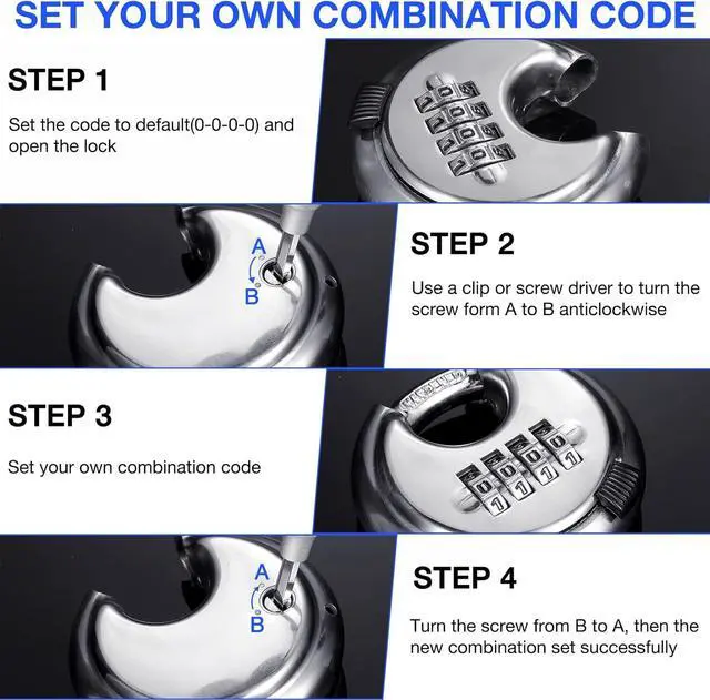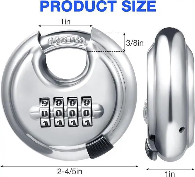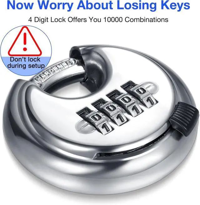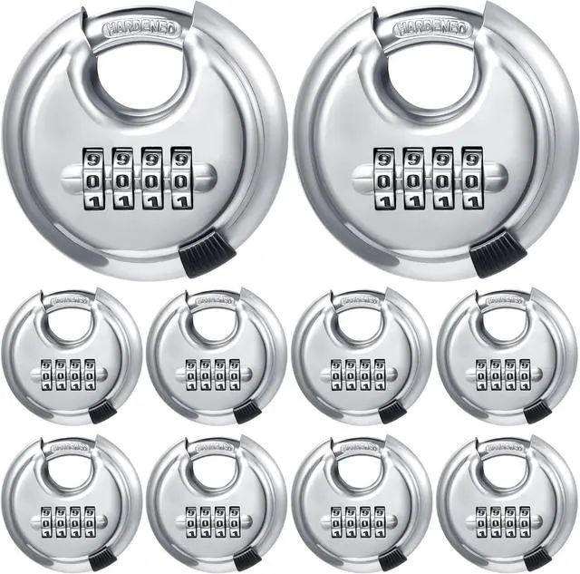 Widely Application: This 4 digital disc padlock design with high-security combination padlock is constructed with stainless steel, anti-rust, anti-corrosion, and anti-freeze, suitable for indoor and outdoor use, such as storage unit lock, garage lock, shed lock, trailer lock, outdoor gates lock, warehouses lock, logistics lock, doors lock, and moving truck lock, etc.