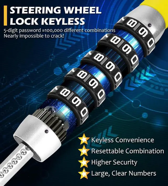 UNIVERSAL FIT: Adjustable and fit for a wide range of steering wheels with an inner diameter between 6.1 and 14.9 inches. The car steering wheel lock is universal for cars, vans, trucks, and SUVs. Each car lock includes 1 lock unit, 1 screwdriver, and 1 code resetter