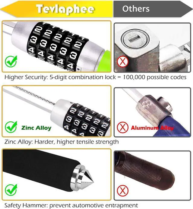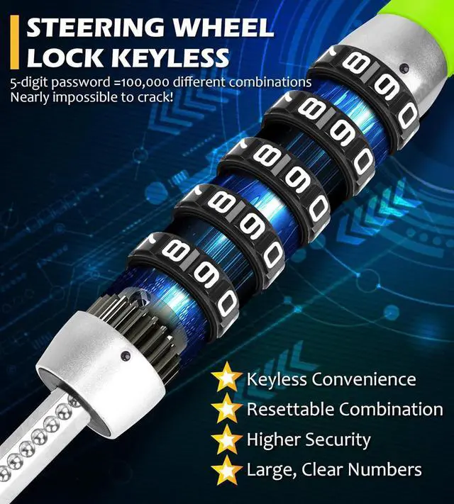 • HIGHER SECURITY: This steering wheel lock anti-theft device has 5 dials and each is numbered zero through nine. It will have a total of 100,000 different combinations. No theft can open it and drive away your car. Nearly impossible to crack