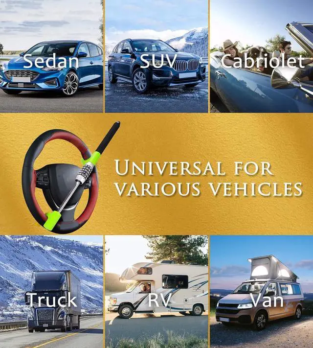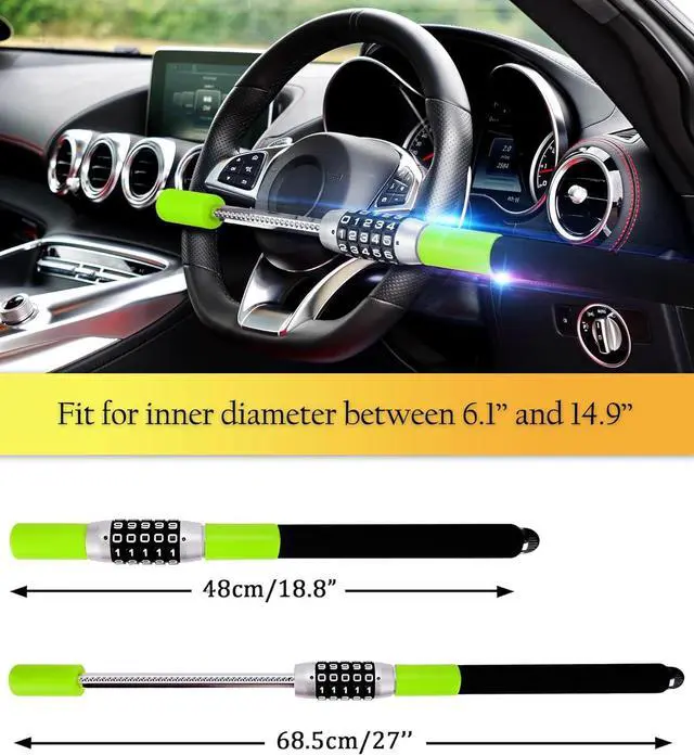 UNIVERSAL FIT: Adjustable and fit for a wide range of steering wheels with an inner diameter between 6.1 and 14.9 inches. The car steering wheel lock is universal for cars, vans, trucks, and SUVs. Each car lock includes 1 lock unit, 1 screwdriver, and 1 code resetter