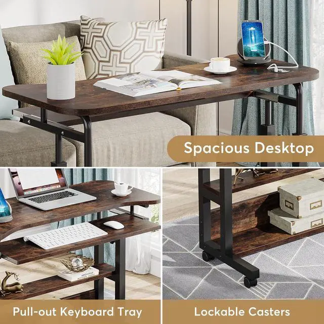 Rolling Laptop Table with Charging Ports, Mobile Home Office Workstation C Shaped TV Tray with Casters, Easily Slide Next to Sofa Couch and Bed.